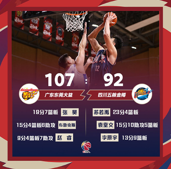 广东(27-4):马尚15分4篮板6助攻,张昊19分7篮板,苏伟11分4篮板,任骏飞8分8篮板3助攻,威姆斯8分2篮板,赵睿9分4篮板7助攻,杜润旺9分3抢断,胡明轩9分3篮板3助攻。