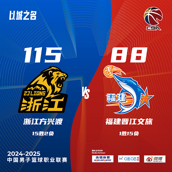 JRS直播吧体育讯北京时间12月13日讯 CBA常规赛,广厦迎战福建。广厦14胜2负联赛榜首,福建1胜14负垫底。一开场,双方开场势均力敌,胡金秋独得9分,福建多点开花给出回应,双方比分交替领先,次节广厦开始发力,胡金秋内外开花,朱俊龙连中三分率队轰出19-4的攻击波取得20分的优势,半场战罢广厦领先福建。下半场,福建连投带罚努力缩小分差,广厦多点开花保持大比分的优势,末节广厦稳扎稳打保持优势,最终,广厦115-88大胜福建。