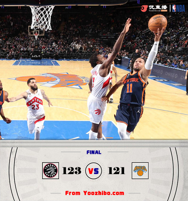 JRS直播吧1月17日讯 NBA常规赛,尼克斯主场迎战猛龙。尼克斯3连胜排在东部第六,猛龙仅列东部倒数第五。上半场,两队开场阶段势均力敌,猛龙持续发力逐渐占据上风,内外开花取得两位数优势,此后尼克斯奋力反击,多点开花轰出22-6的攻击波一举扭转颓势,半场战罢尼克斯59-56领先猛龙。下半场,双方继续缠斗,尼克斯始终保持微弱优势,末节双方争夺陷入白热化,范弗里特连得5分将比分扳平。关键时刻巴恩斯2罚1中,巴雷特一条龙反击将比赛拖入加时。加时赛,阿努诺比连中三分,尼克斯连续抢到前场篮板连投带罚迫近比分,但布伦森错失绝杀三分。最终,猛龙加时123-121击败尼克斯,终结了对手的3连胜。