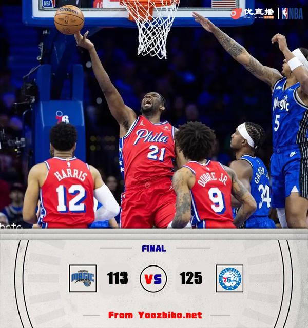 JRS直播吧讯 4月13日讯 NBA常规赛,76人主场迎战魔术,76人人目前6连胜,45胜35负排在东部第7位,而魔术46胜34负排在东部第5位。双方上来比较慢热,小卡特接连篮下暴扣为魔术开局,恩比德接连造杀伤回应,76人外线开火一波11-0攻击波建立双位数领先,随后双方围绕10分左右分差展开对攻战,76人接连外线发炮领先13分,次节魔术依靠替补的出色发挥追分,但恩比德里突外投还能强势回应,双方展开对攻战,恩比德疑似受伤离场,半场魔术追到差6分。下半场,76人发力上来就是14-5进攻波拉开比分,魔术接连三分止血,双方再次展开拉锯战,76人保持十几分领先,末节大小瓦格纳再次联手帮助魔术一度追到个位数分差,但马克西里突外投连砍9分强势止血回应,76人还是保持住10分左右领先,最终76人125-113力克魔术。