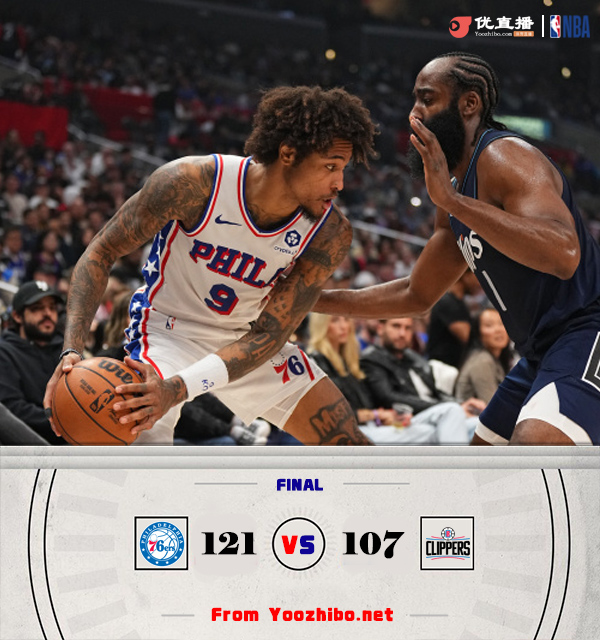 JRS直播吧3月25日讯 NBA常规赛,快船主场迎战76人。快船西部第四,76人东部第八。比赛开始,76人反客为主率先发力,哈里斯高效输出帮助球队取得领先,哈登连投带罚拿分追赶,76人持续发力获得两位数优势,次节76人越战越勇一度将分差拉开到17分,哈登连送助攻带队追赶,半场战罢76人63-56领先7分。易边再战,快船努力反击追平比分,但马克西得分助攻一肩挑稳住局势,末节快船突然哑火,76人一波20-5将分差拉开到20分以上,卢换下主力投子认负。最终,快船107-121不敌76人,主场落败。