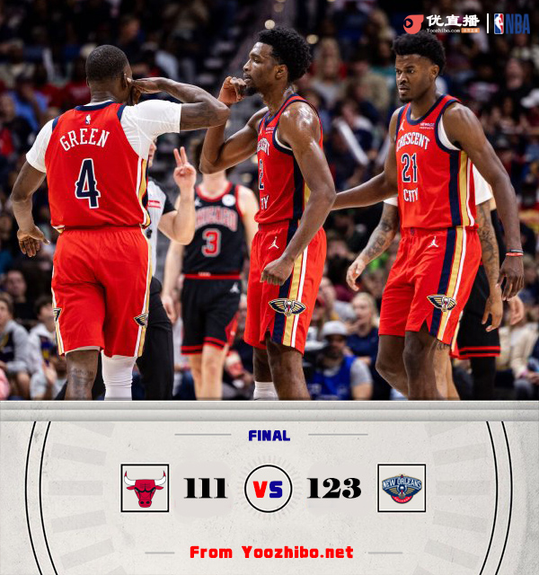 JRS直播吧10月24日讯 NBA常规赛全面开打,鹈鹕首战主场面对公牛,此役鲍尔时隔1013天重返常规赛赛场。比赛开打后双方稍显慢热,短暂试探后鹈鹕开始发力,英格拉姆联手麦科勒姆接连取分,首节结束时鹈鹕领先4分,次节回来,拉文手感爆棚单节飚中4记三分,公牛稳扎稳打一度反超,末段两队你来我往陷入僵持,半场战罢,鹈鹕保有1分优势。易边再战后公牛进攻再次出现停滞,麦科勒姆里突外投不断打进,鹈鹕一波13-3再次拉开比分,琼斯压哨三分命中,三节结束后鹈鹕将优势扩大到15分,末节上来,公牛始终无法打出追分高潮,比赛提前失去悬念,最终鹈鹕123-111击败对手迎来开门红。