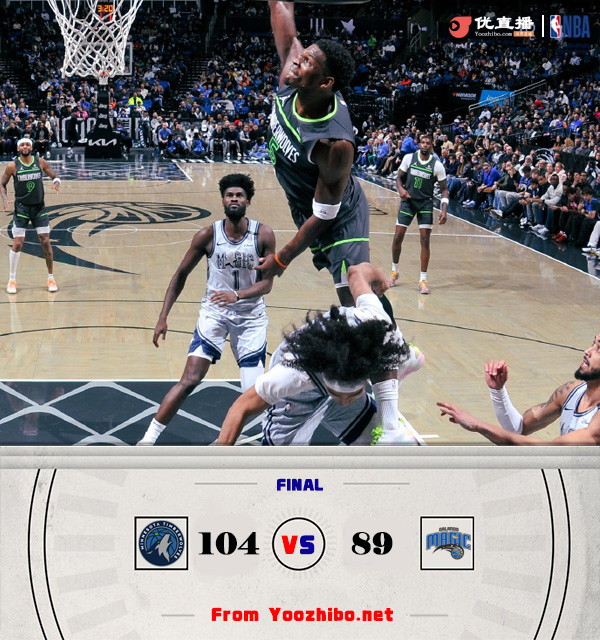 JRS直播吧讯北京时间1月10日讯 NBA常规赛,森林狼客场挑战魔术。森林狼19胜17负排西部第八,魔术22胜16负排东部第四。一开场,森林狼率先发力,爱德华兹独中3记三分带队取得两位数领先,次节科尔-安东尼高效发挥带队扳平比分,森林狼内外开花稳住局势,半场战罢森林狼52-39领先魔术。下半场,波普连中三分带队迫近比分,爱德华兹贡献惊人战斧暴扣,森林狼起势多点开花重夺两位数领先,末节森林狼稳扎稳打保持优势,魔术苦苦追无果,最终,森林狼104-89轻取魔术,迎来3连胜。