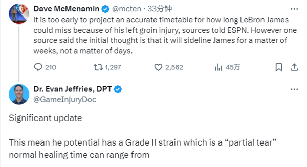 对于詹姆斯的伤势,医学专家Evan Jeffries表示,詹姆斯拉伤腹股沟,MRI结果将会决定这次伤势的严重程度和养伤时间,一级拉伤1到2周,二级拉伤4到6周;看到McMenamin的报道后,该专家表示詹姆斯可能遭遇腹股沟二级拉伤(部分撕裂),一般休养3-6周。