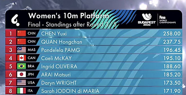 陈芋汐的动作是难度3.3的626C,完成的相当好,得到85.80分,反超全红婵,升至第一名。