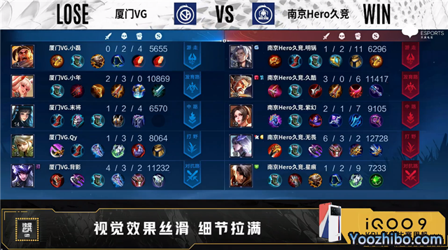 开局南京Hero五人中路抢线击杀公孙离拿到一血。1分43秒野区团战厦门VG打出0换2。2分42秒厦门VG中路击杀不知火舞。3分09秒厦门VG发育路击杀镜。4分55秒厦门VG拿下暴君。5分26秒南京Hero对抗路击杀马超。6分53秒厦门VG中路击杀鲁班大师。7分49秒厦门VG中路击杀镜。8分22秒厦门VG摧毁敌方发育路二塔。9分08秒南京Hero对抗路击杀马超。9分27秒主宰处团战厦门VG击杀夏侯惇。10分15秒发育路团战南京Hero打出1换2。11分34秒野区团战南京Hero打出0换3。12分08秒南京Hero摧毁敌方中路高地塔。15分10秒南京Hero拿下暗影暴君。15分43秒中路团战南京Hero打出0换3。16分08秒南京Hero团灭对手摧毁水晶拿下比赛。