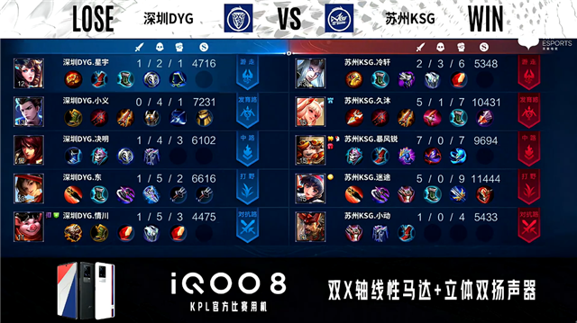 开局深圳DYG廉颇中路抢线被打残。1分04秒苏州KSG发育路击杀鲁班大师拿到一血。2分22秒苏州KSG拿下主宰。2分38秒苏州KSG野区击杀上官婉儿。3分01秒苏州KSG发育路击杀娜可露露。4分01秒苏州KSG拿下暴君。4分27秒中路团战苏州KSG击杀上官婉儿。4分38秒苏州KSG摧毁敌方中路外塔。6分16秒苏州KSG摧毁敌方对抗路二塔。6分57秒苏州KSG摧毁敌方发育路二塔。7分09秒苏州KSG拿下主宰。8分40秒苏州KSG摧毁敌方对抗路高地塔。8分48秒野区团战苏州KSG打出0换2。9分10秒苏州KSG摧毁敌方中路、发育路高地塔。9分34秒高地团战苏州KSG云缨拿到三连决胜并摧毁敌方水晶拿下比赛。