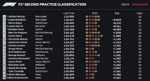 二练停表后,博塔斯凭借1:33.593的成绩获得第一,梅赛德斯也再次包揽练习赛的一二,汉密尔顿落后0.044秒排名第二;加斯利第三,诺里斯第四,奥康第五;第六至第十的车手分别是:维斯塔潘、塞恩斯、阿隆索、维特尔、勒克莱尔。