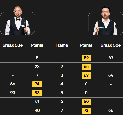 比赛开始后,肖国栋状态出色,很快进入比赛节奏。凭借精准的进攻和稳定的发挥,他连续打出高质量的击球,建立起领先优势。在前几局中,肖国栋就打出了多杆高分,为自己奠定了良好的基础,以 3-0 的比分领先霍金斯。