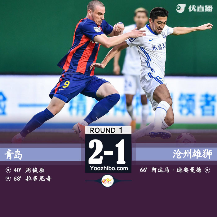 JRS直播吧4月21日讯 北京时间4月21日18:00,中超联赛第一阶段第1轮,青岛对阵沧州雄狮。上半场,周俊辰抽射破门,穆里奇包抄打飞失良机。下半场,迪奥曼德扳平比分,拉多尼奇世界波破门再次超出,此后双方未能改写比分。全场比赛结束,青岛2-1战胜沧州,取得新赛季开门红。