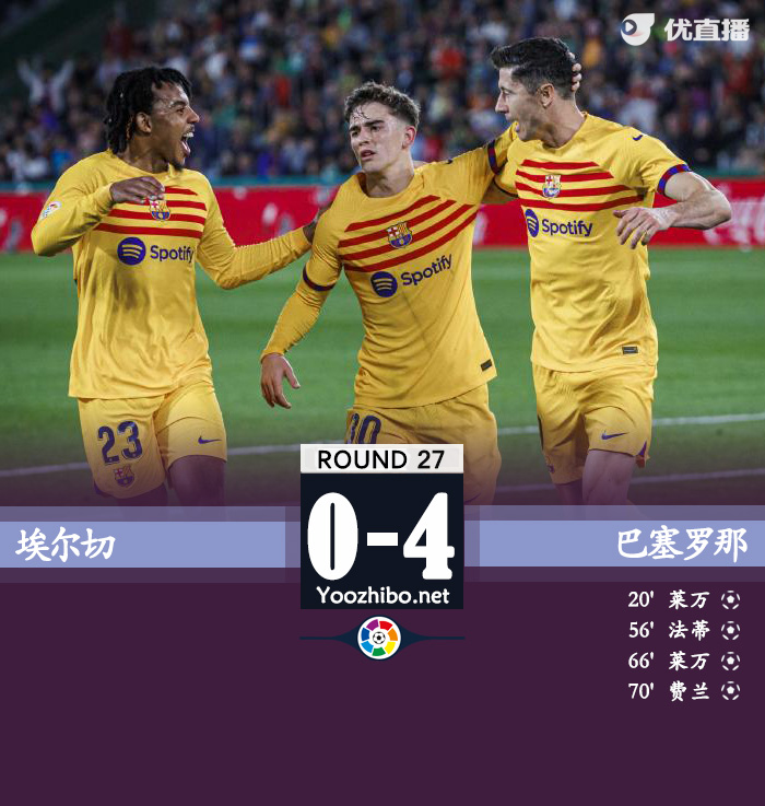 JRS直播吧讯 北京时间4月2日凌晨3点整,2022-23赛季西甲第27轮在巴雷罗球场展开角逐,巴塞罗那客场挑战埃尔切。上半场莱万首开纪录,下半场法蒂和费兰打破球荒,莱万传射建功。最终巴萨客场4-0大胜埃尔切,巴萨取得联赛四连胜。积分榜方面,巴萨积71分继续领跑,领先第二名皇马15分,埃尔切积13分垫底。