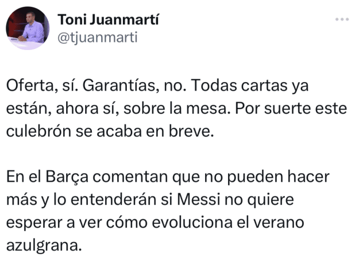 来源:JRS直播吧06-07 11:32JRS直播吧06月07日在大巴黎官宣梅西自由身离队后,阿根廷球王未来去向,无疑是这几天全世界球迷最为关注的焦点之一。北京时间6月7日,来自加泰知名记者Toni Juanmartí的消息,尽管巴萨已经尽了一切努力,但他们现阶段无法保证能够注册梅西。
