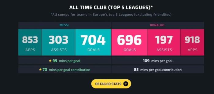 梅西:163次出场,129球、40次助攻,平均每105分钟打入一球,平均每80分钟制造一球。