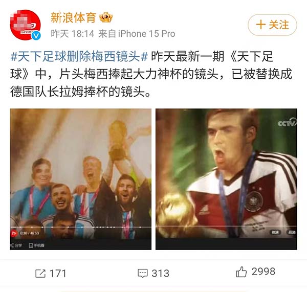 梅西不理事情继续发酵,不等于事情没有在发酵,比如说某浪体育报道的央视的最新重要举动。众所皆知,央视有一档重磅的足球节目,这一档节目叫作《天下足球》,此前这一档节目的片头中有梅西捧起大力神杯的镜头,而在最新一期的《天下足球》中,梅西捧杯的画面已经替换成为了德国队长拉姆捧杯的镜头。