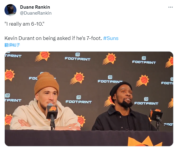 赛后谈到自己的身高问题,杜兰特笑着说道:我真的只有6尺10(约2米08),过去两个赛季我量的时候都是6尺10。我没有7尺(约2米13)。我经常打内线,拥有一双长臂,所以有时候我可以防守一些7尺的球员,但我真的只有6尺10。
