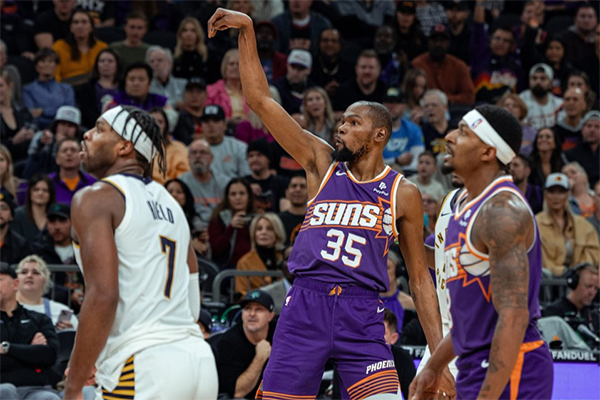 主场对阵步行者,杜兰特上下半场各拿20分,末节7中6独砍13分带队拒绝逆转,35岁全场0罚球轰下40分,赛后太阳主帅沃格尔表示:我们要寄一份杜兰特被对方犯规,却没得到裁判判罚的录像给联盟,我们的领袖在防守端的表现令人惊叹。