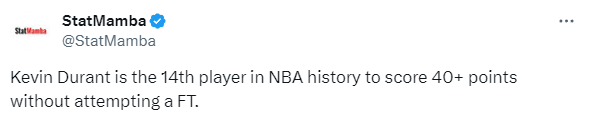 5、杜兰特成为NBA历史上第14位0罚球砍下40+的球员