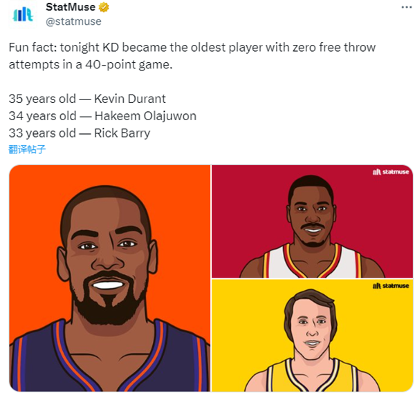 3、杜兰特成为历史上0罚球40+的最年长球员(35岁),排在杜兰特后面的是大梦(34岁)和里克-巴里(33岁)。