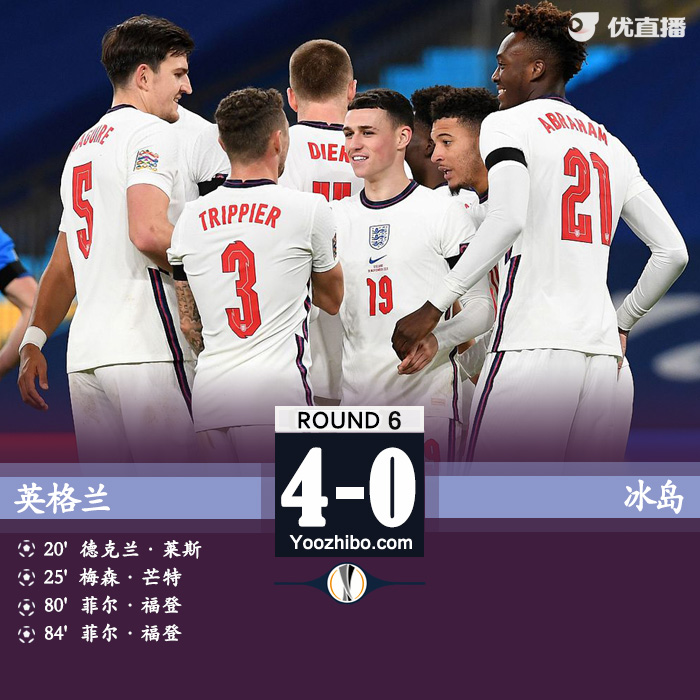 JRS直播吧讯:北京时间11月19日03:45(英国当地时间18日19:45),2020/21赛季欧国联A组第2小组第6轮一场焦点战在温布利大球场展开争夺,英格兰主场4比0大胜冰岛,莱斯和芒特进球,福登梅开二度。英格兰终结连败,冰岛全负垫底。这是两队第5次交锋,此前英格兰取得2胜1平1负。马奎尔、福登和萨卡轮换出场。
