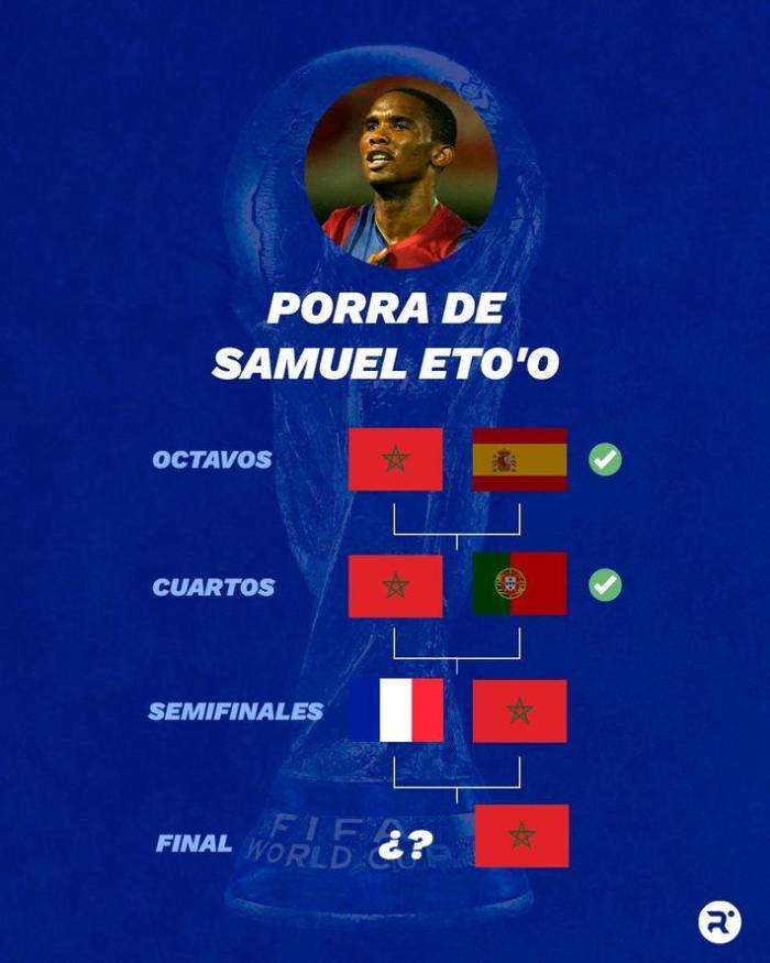 早在世界杯开始前,埃托奥就表示摩洛哥能进决赛,他当时表示:“摩洛哥将会晋级决赛,他们会在1/8决赛淘汰西班牙,1/4决赛淘汰葡萄牙,半决赛淘汰法国。另一支晋级决赛的球队是喀麦隆,会在1/4决赛击败比利时,在半决赛淘汰塞内加尔。”