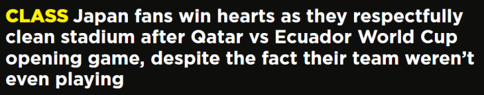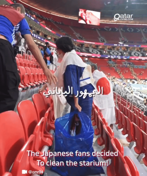 日本球迷揭幕战后留下来清理球场,卡塔尔球迷震惊