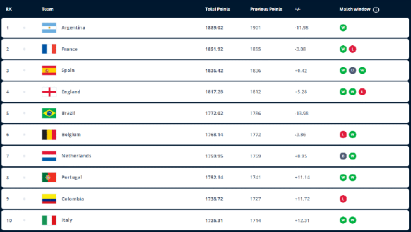 世界顶级强队方面,前15名均无变化,阿根廷、法国、西班牙、英格兰和巴西,位列世界第1至第5位。
