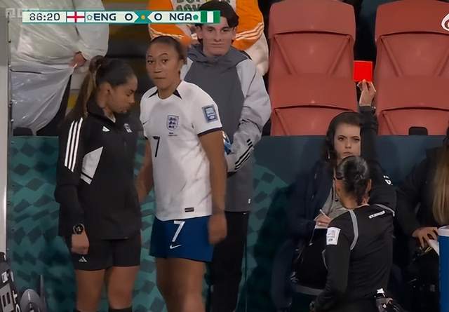 下半场一开始,尼日利亚卡努头球,再度击中横梁。随后的比赛波澜不惊,尤其是英格兰几乎没有创造得分机会。第84分钟,心态失衡的劳伦·詹姆斯故意踩踏尼日利亚球员后背,经过VAR提示,裁判掏出红牌将她罚下。此后,局势完全被尼日利亚掌控。90分钟双方0-0,比赛进入加时。加时赛,尼日利亚依然掌控局面,但始终未能破门,双方进入点球决战。