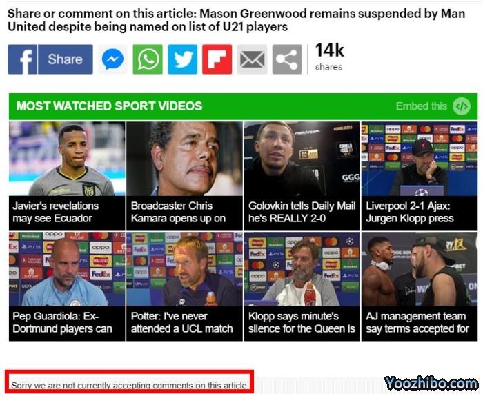 值得一提的是,在报道曼联为格林伍德在英超注册的消息时,英国《每日邮报》罕有地关闭了评论区,显然也知道这是一个充满争议的举动。