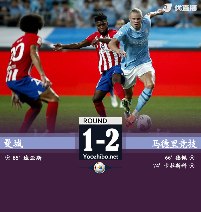JRS直播吧7月30日讯 北京时间7月30日晚上19:40,曼城与马竞进行一场友谊赛。上半场,莫拉塔失良机。下半场,沃克重炮中框,德佩、卡拉斯科先后远射建功,迪亚斯扳回一球。全场结束,曼城1-2马竞。