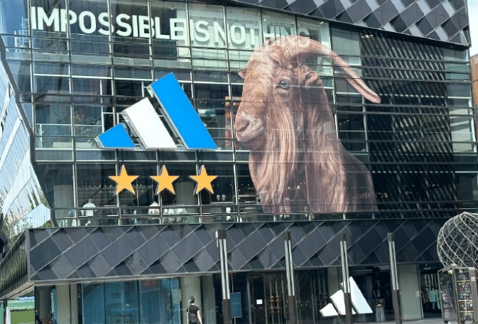 梅西来到北京,作为梅西个人赞助商的阿迪达斯也有新的动作,三里屯的阿迪店新装饰,标志已经换成了阿根廷队的蓝白色,同时还有一个巨大的山羊,代表着梅西是历史最佳,相当霸气。