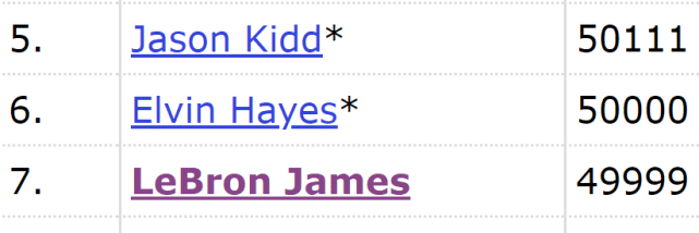 首先,詹姆斯目前常规赛生涯总出场时间是49999分钟,排名历史第7位。只要他在对火箭比赛中出战,出场时间就将达到50000分钟里程碑,而且将超过排名第6的埃尔文-海耶斯(50000分钟),他的下一个超越目标是杰森-基德(50111分钟)。