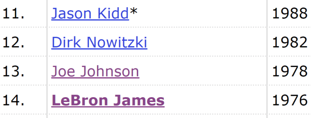 第二,詹姆斯目前生涯三分命中数是1976个,排名历史第14位。他有望在对火箭一战中追平甚至超越排名第13位的乔-约翰逊(1978个)。排名第12位的诺维茨基(1982个)和第11位的基德(1988个),也都在詹姆斯近期追赶的范围内。本赛季,詹姆斯场均命中2.3个三分球。