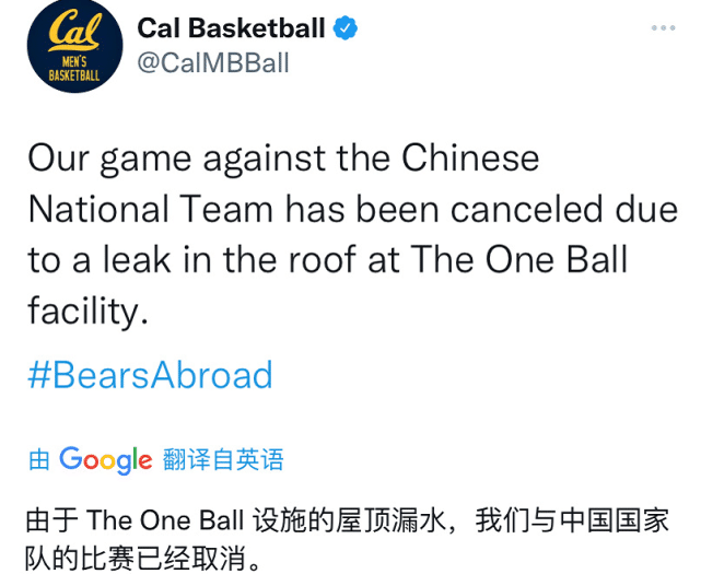 在法国的第二场比赛对手是NCAA一级联盟排名第150名的加州大学伯克利分校男篮,对手实力偏弱,中国男篮被认为有可能会取得胜利,收官热身赛。但无奈的是这场比赛被取消了,原因是场馆屋顶漏水,所以比赛没有办法进行。