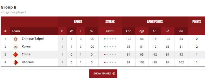 中国队输球之后的排名来到B组第三,仅仅领先首战溃败的巴林队。亚洲杯的规则是16支球队分为4个小组,小组第一直接晋级八强,小组2-3名出战附加赛,一场定胜负之后决出剩余4个八强席位。中国男篮接下来即便是两战全胜也有可能无法拿到小组第一,当然如果连续大胜,同时韩国队掉链子的话,中国男篮还是有一定的机会。