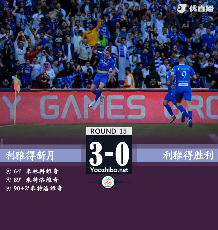 JRS直播吧讯 北京时间12月2日凌晨2点整,2023-24赛季沙特联第15轮展开角逐,利雅得新月坐镇主场迎战利雅得胜利。上半场阿奇迪失误险送礼,下半场米林科维奇头球破僵,C罗进球被吹越位,米特洛维奇梅开二度,布莱希染红。最终利雅得新月主场3-0完胜利雅得胜利,胜利各赛事20场不败遭终结,新月联赛15轮不败。积分榜方面,新月积41分以7分优势领跑,胜利位居次席。